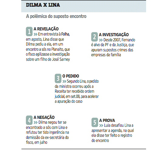 Segundo a ex-secretária, o encontro foi chamado por Dilma e teve um só tema: um pedido para "agilizar" a investigação do fisco nos negócios da família de José Sarney (PMDB), aliado do governo Lula e hoje presidente do Senado.
